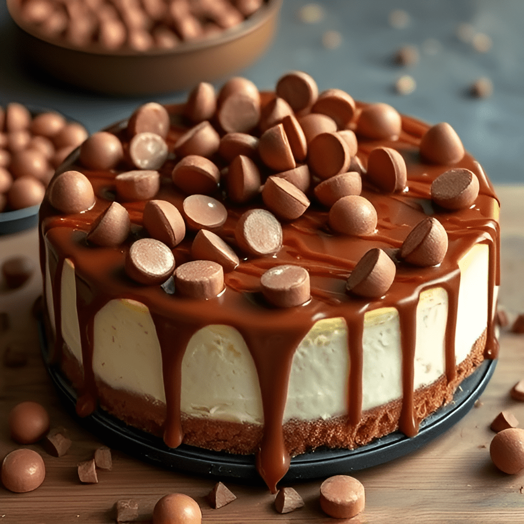 Set on a digestive and salted butter base, high+equality melted Belgian milk chocolate is combined with our light, creamy cheesecake, laced with milk Belgian chocolate sauce, and then topped with a generous helping of chocolate yumminess with Malteasers and finished off with a final drizzle of Belgian milk chocolate sauce.
